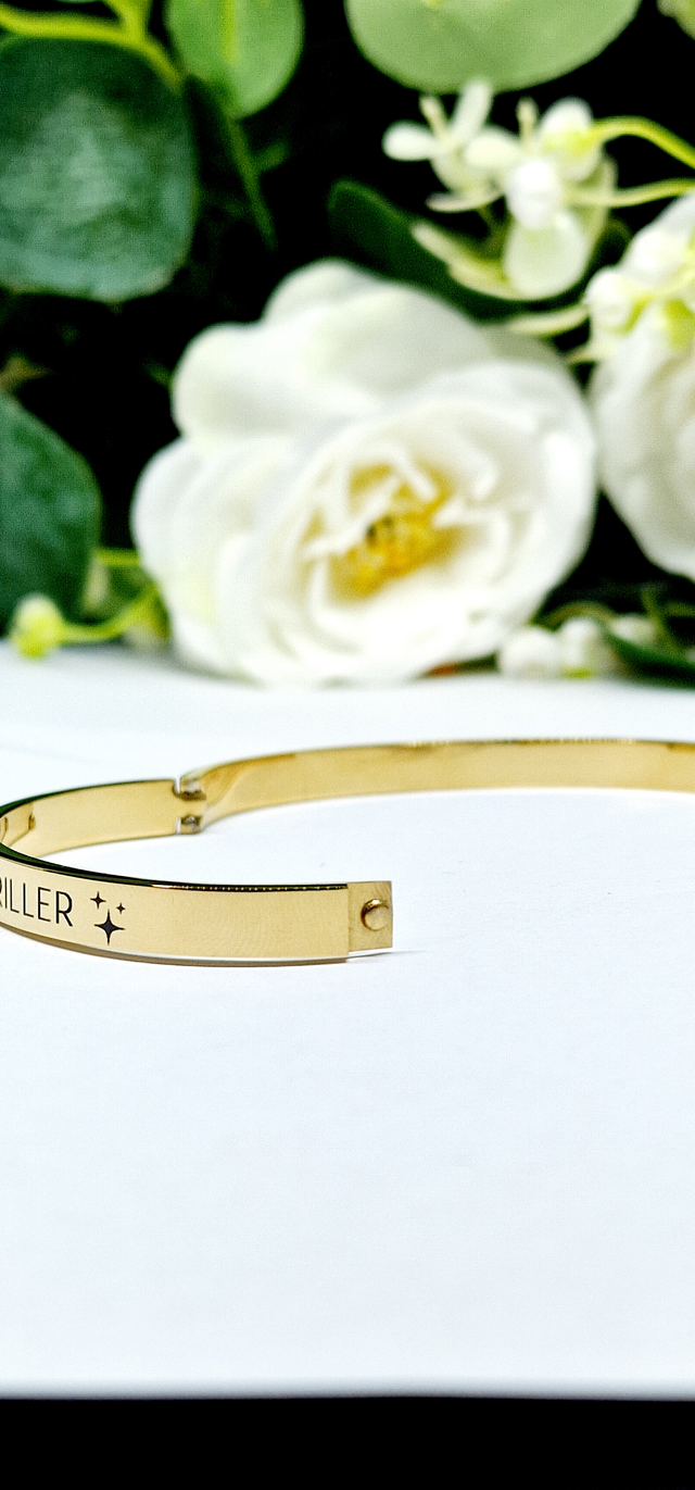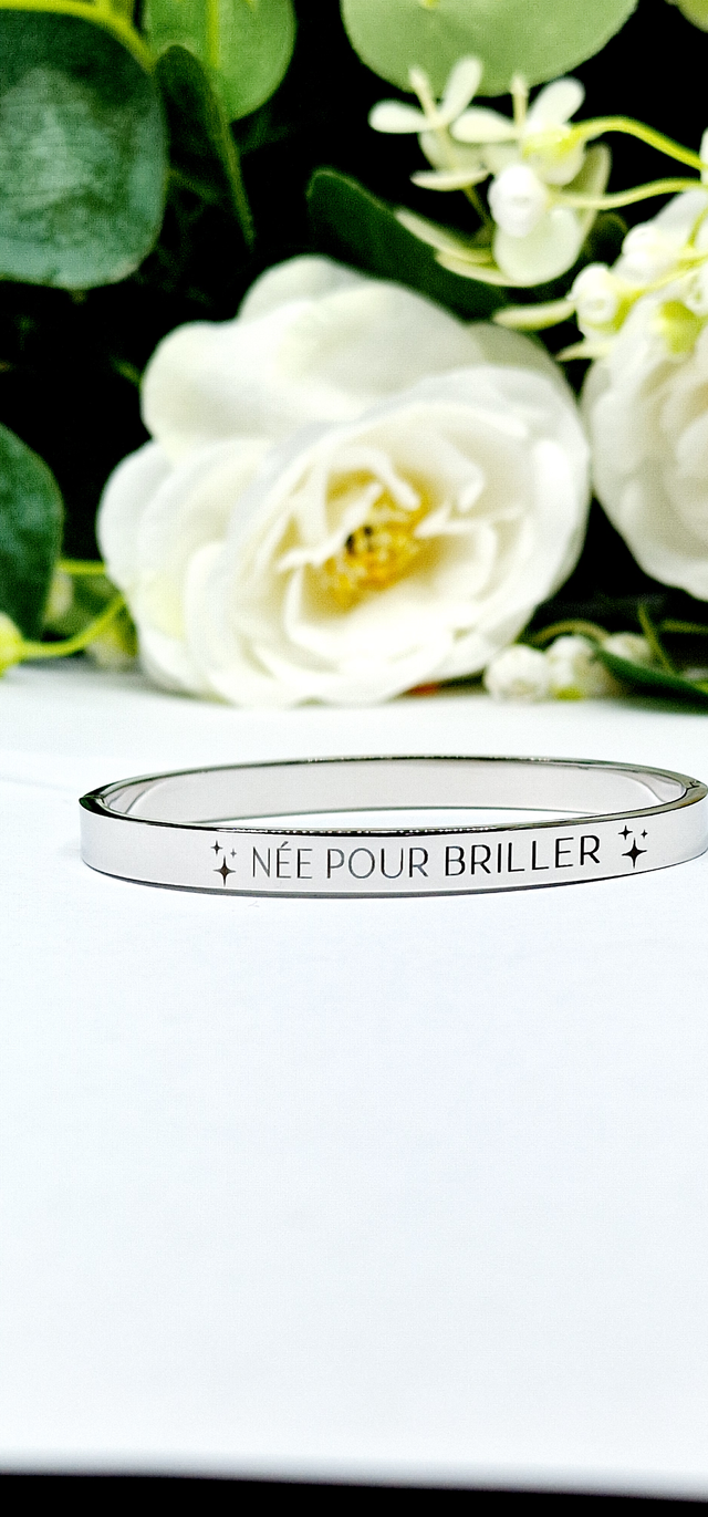 Gravé dans mon atelier, ce bracelet en acier inoxydable plaqué or ou argent a été conçu pour rappeler à chaque femme sa valeur et son appel à rayonner.